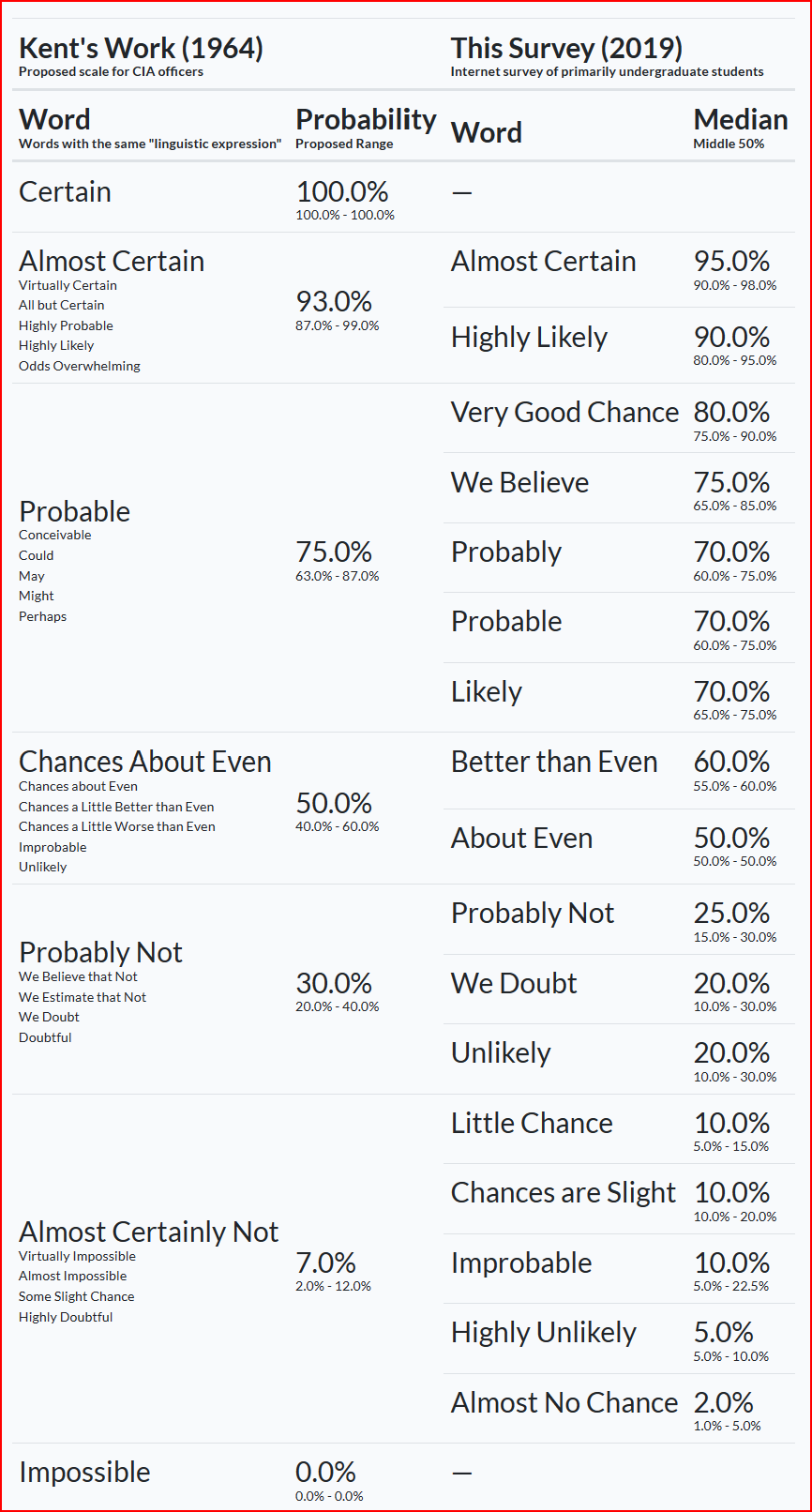Different groups would introduce variations to Sherman Kents scale, usually without understanding how it was built (via necessity of wartime intelligence communications) or what it was meant to do (use spoken language structures to orient people to better address underlying probabilities).